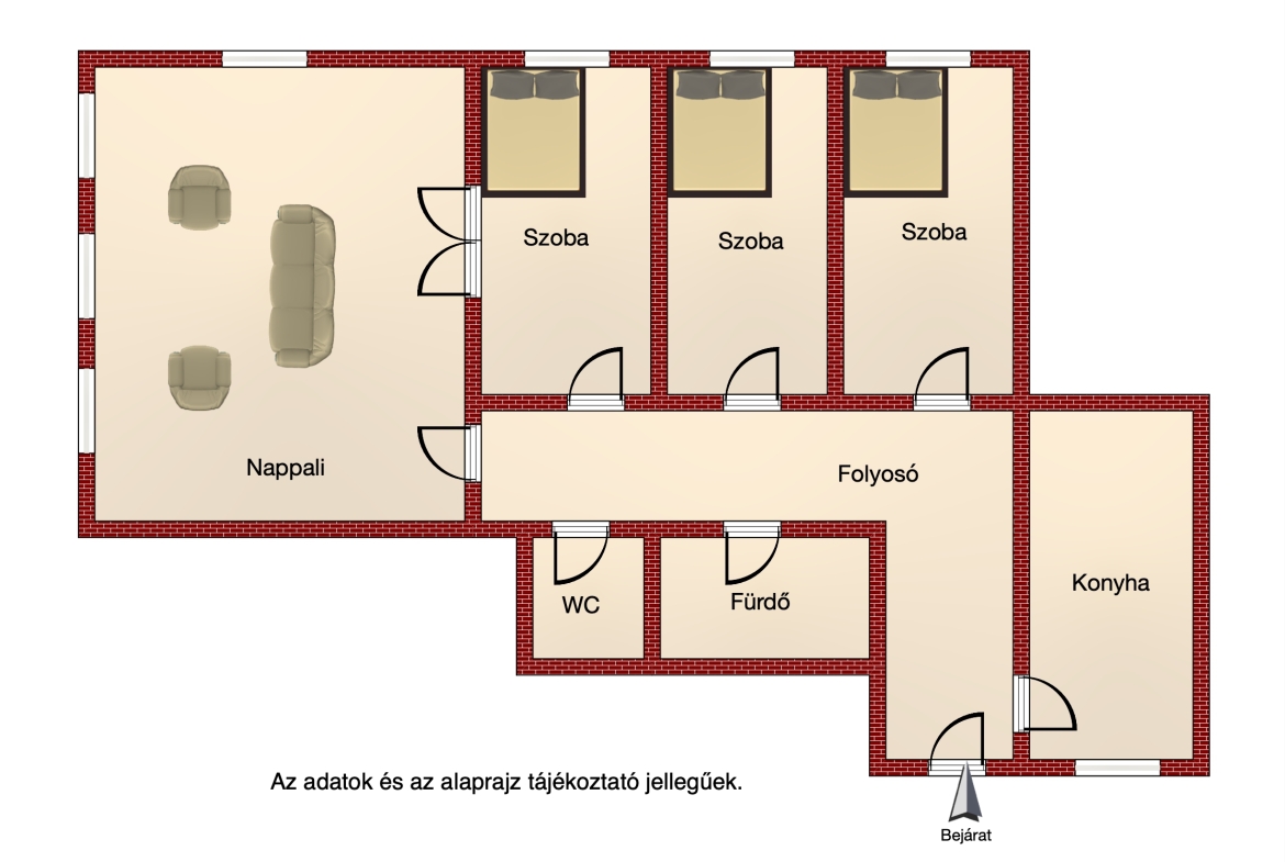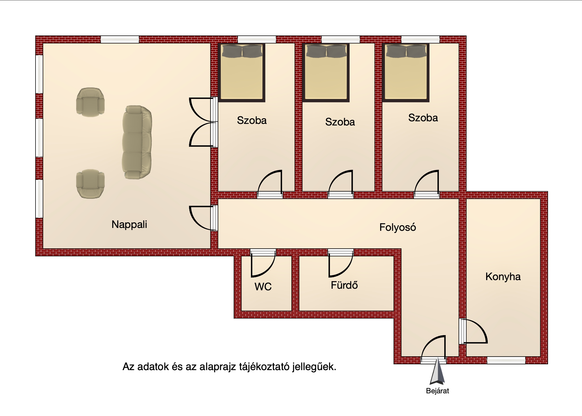 Az ingatlan három hálószobával és egy nagyméretű nappalival valamint különbejáratú konyhával rendelkezik.