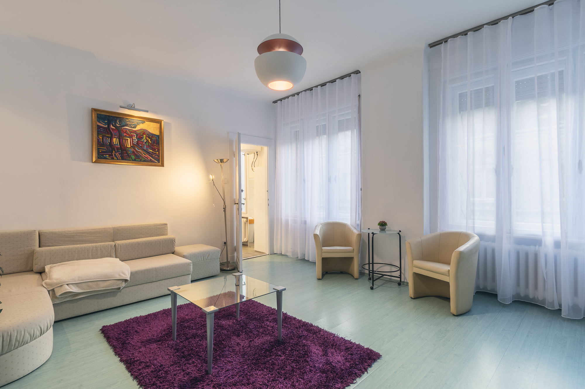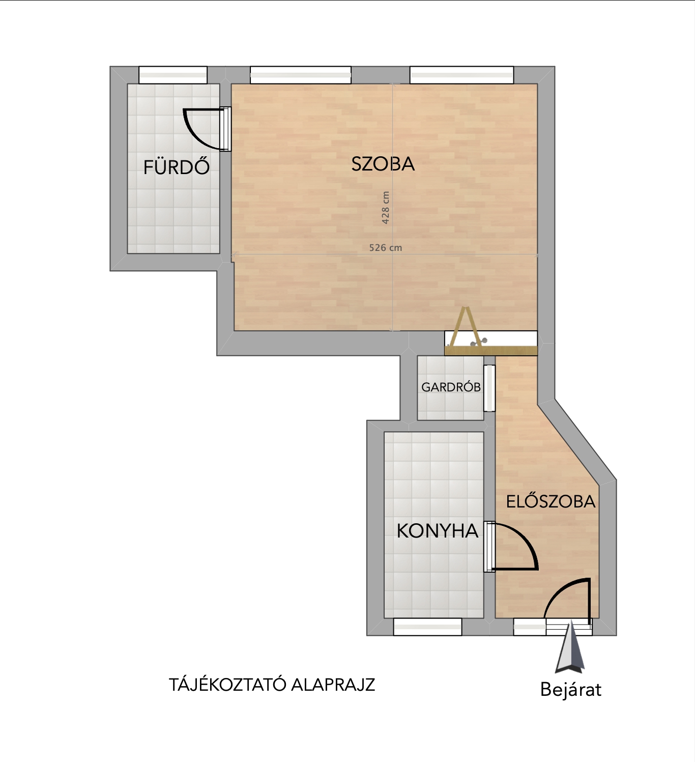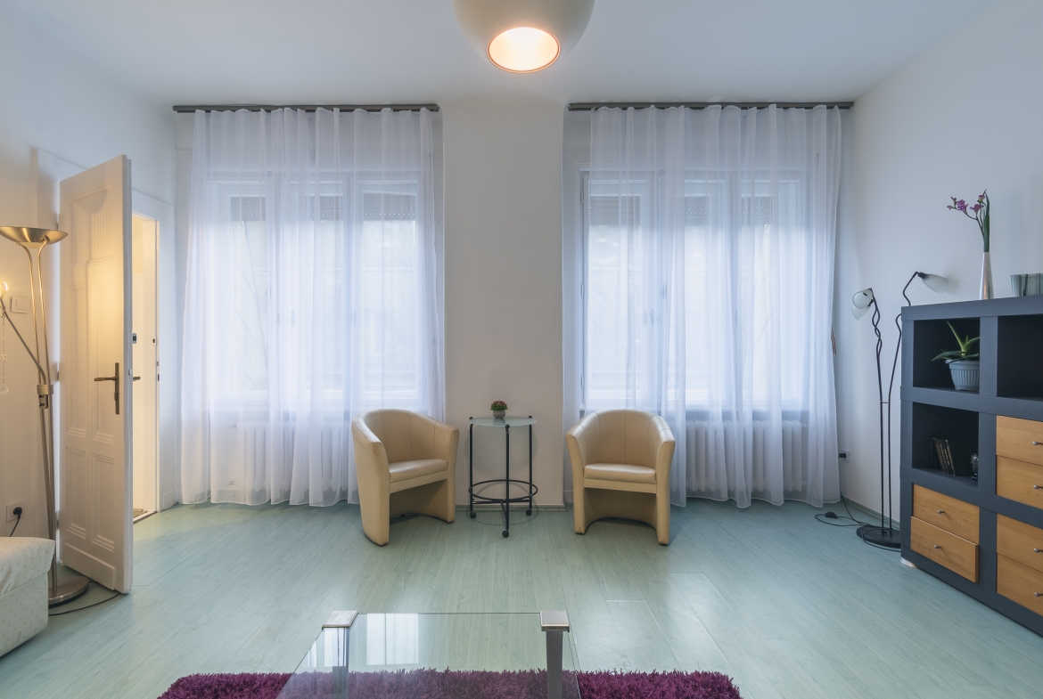 A nagy ablakoknak köszönhetően egész nap világos. A nappali mérete lehetővé teszi, hogy igény szerint külön hálószoba alakítható ki.